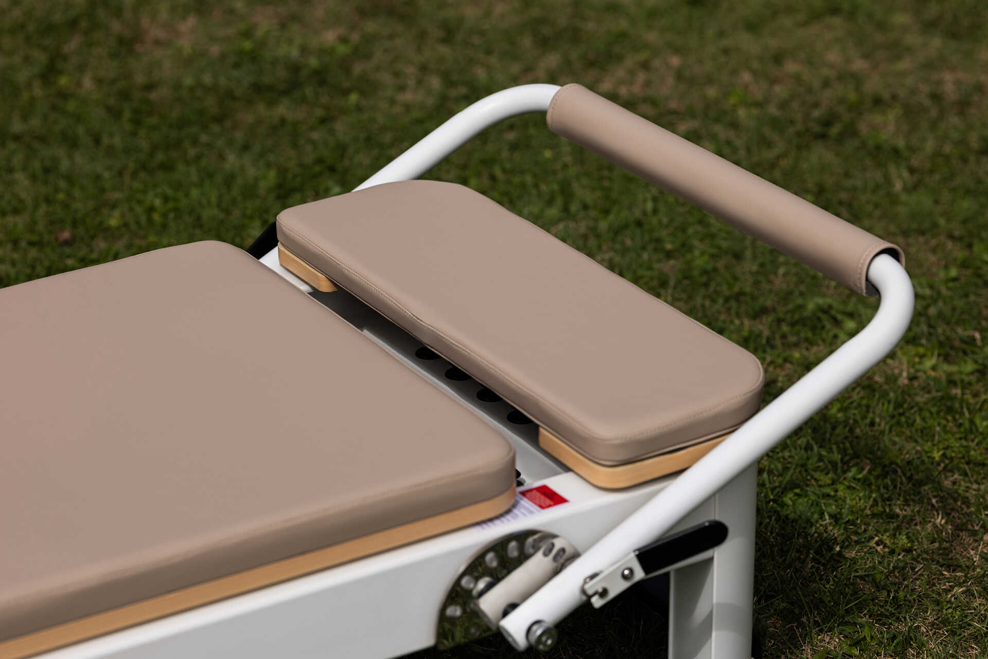 The Liveness Aluminum FoldableReformer , in delicate Moon & Sand shades, was created for those who want to take the beauty of Pilates everywhere, without sacrificing style.