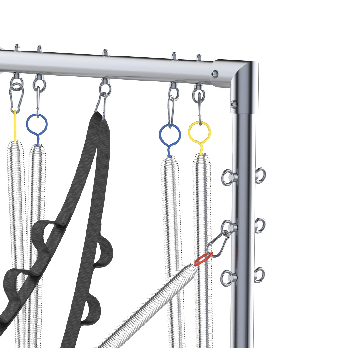 La resistencia ajustable permite personalizar la intensidad de los ejercicios, mientras que el amplio equipamiento -correas, asas, barras y 8 muelles de alambre de acero fabricados en Alemania con 23 puntos de fijación- garantiza la máxima versatilidad y seguridad en cada movimiento.