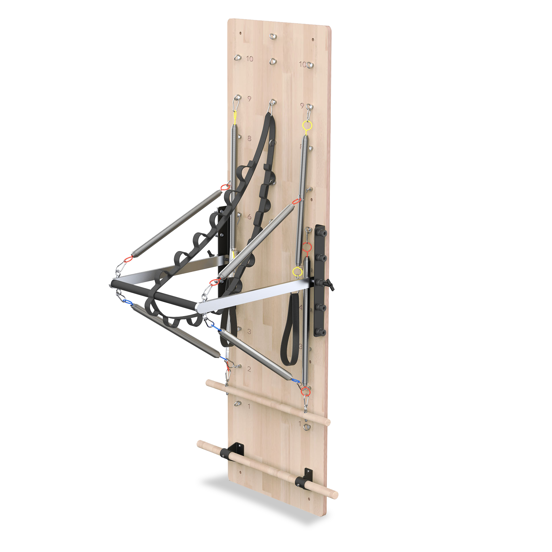 De multifunctionele en superuitgeruste Spring Wall Unit neemt weinig ruimte in beslag en stelt je in staat om oefeningen uit te voeren die vergelijkbaar zijn met die op een Cadillac Reformer of Tower.