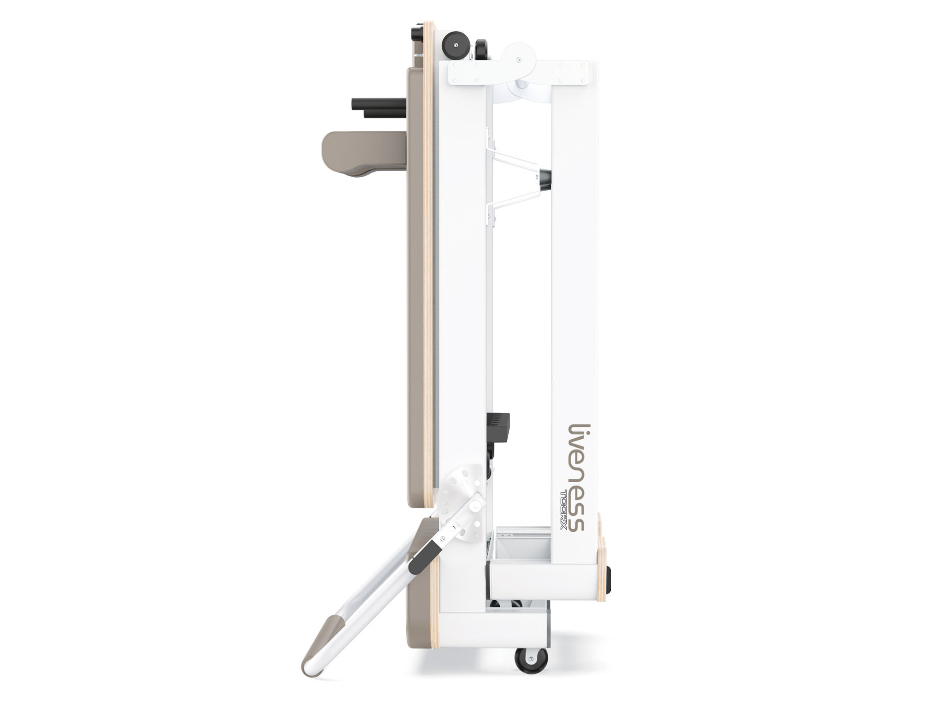 O LivenessReformer dobrável em alumínio, em delicados tons Moon & Sand, foi criado para quem quer levar a beleza do Pilates para todo o lado, sem sacrificar o estilo.
